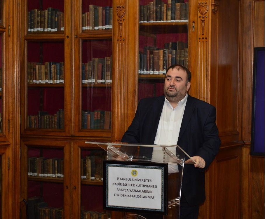 Resim 1: İstanbul Üniversitesi Nadir Eserler Kütüphanesi’nde Bulunan Arapça El Yazmalarının Yeniden Kataloglanması projesi tanıtımında konuşmalarını yaparken